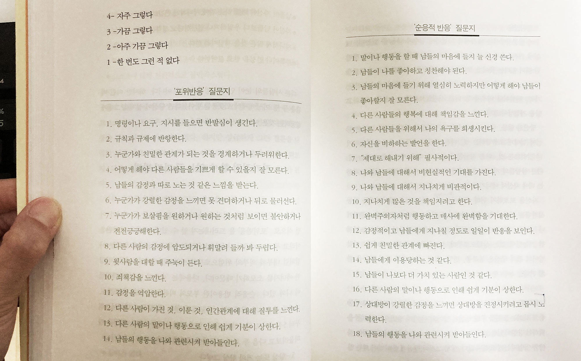 * 아래의 문항지를 보고 내게 해당되는지 자가 테스르 해보실 수 있습니다.많은 항목에 해당될 수록 나 자신이 그러한 반응을 하고 경험을 한다는 의미입니다.
